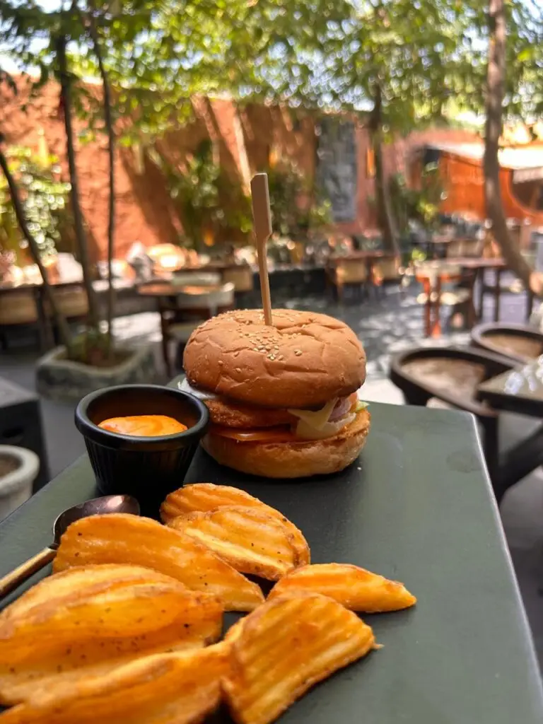 “KOMO House Chandigarh cafe veggie burger with fries and aesthetic outdoor background”